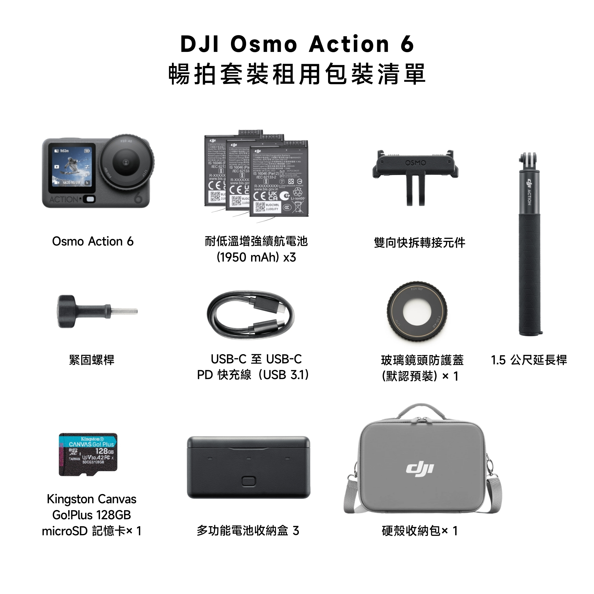 最新一代 DJI Osmo Action 6 強勢登場!無需花費萬元購買新機,透過我們的【暢拍套裝出租方案】,您將擁有總共 3 顆原廠耐寒電池,徹底解決電量焦慮。用最划算的租金,體驗頂級畫質與超強防手震科技。